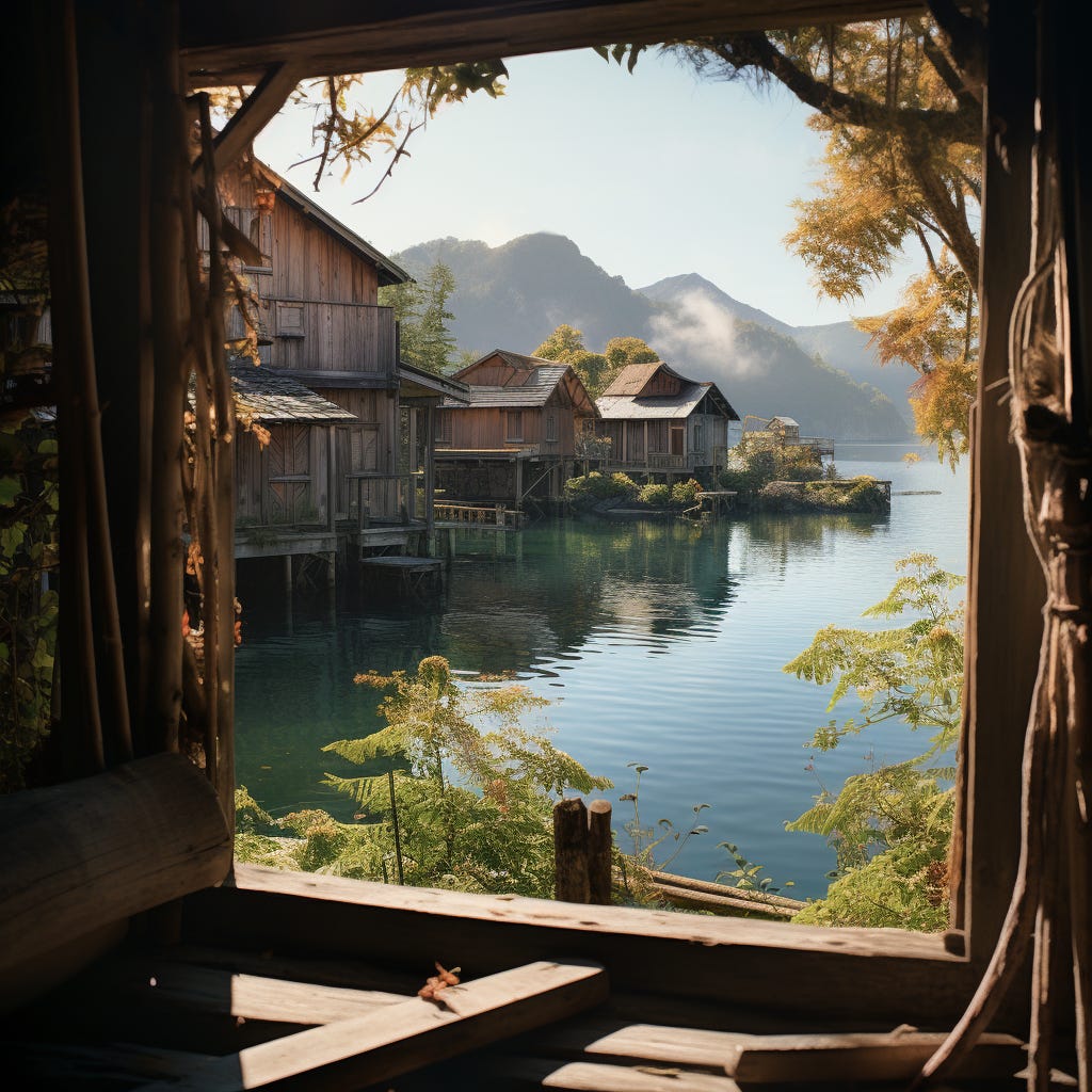 The tranquil waters of the small, circular lake adjacent to the trading town basked in the sun's radiance. From the wooden-crafted window of the cabin, I observed several ships bobbing in the harbor and along the cliffside. I had just risen out of bed, and the sight that greeted me left me agape - I could hardly believe I was still here.